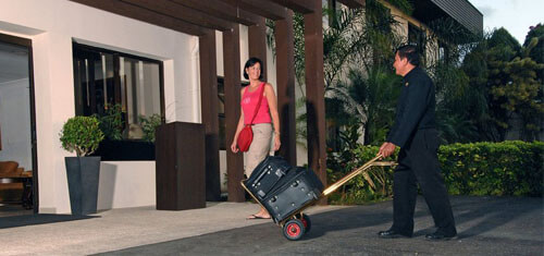 Picture of guests arriving at the beautiful Costa Rica Medical Center Inn in San Jose, Costa Rica.  The picture shows a guest arriving at the entrance and an employee bringing her luggage in a cart.
